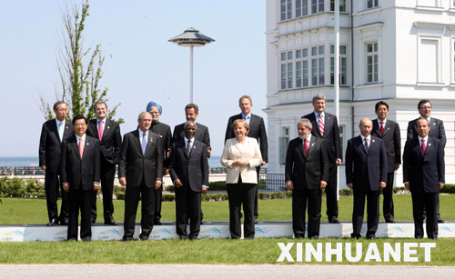 6月8日,國家主席胡錦濤在德國海利根達姆出席八國集團同發展中國家領導人對話會議。這是會后與會領導人合影留念。 新華社記者鞠鵬攝