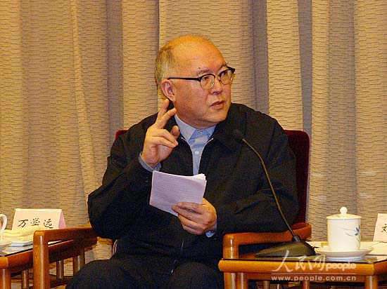 浙江省原省長、人事部原副部長萬學遠在座談會上發言。