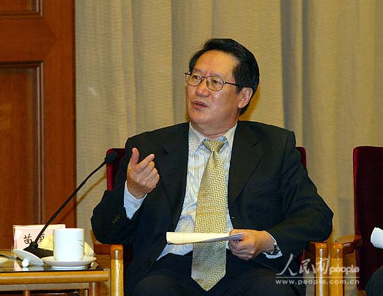 中國人壽保險集團公司原副總經理苗復春在座談會上發言。