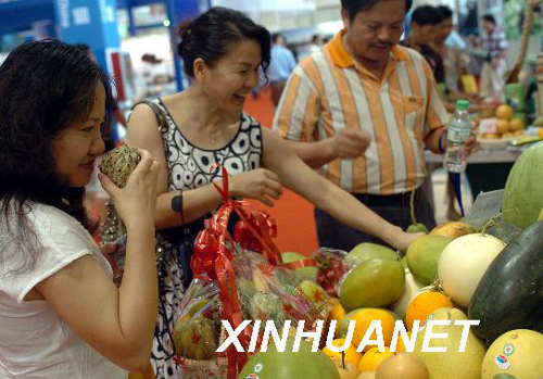 資料圖片:9月2日,在廣西玉林,參觀者觀看從臺灣引進的水果。當日,第三屆桂臺經貿合作交流會產品展在廣西玉林市舉行,集中展示了桂臺農業(yè)合作的成果。近年來,廣西和臺灣農業(yè)合作不斷加強,僅2006年廣西就成功引進臺灣農業(yè)項目13個。新華社記者 周華 攝