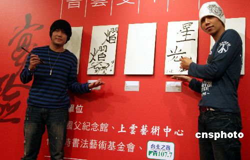 展覽開幕式上,臺灣當(dāng)紅藝人“星光二少”潘裕文、許仁杰以及三位臺灣書壇新秀還現(xiàn)場揮毫潑墨,為傳統(tǒng)與實驗書藝展捧場助興。據(jù)悉,在臺北展出至本月二十日結(jié)束后,該展還將于月底移師高雄展出。