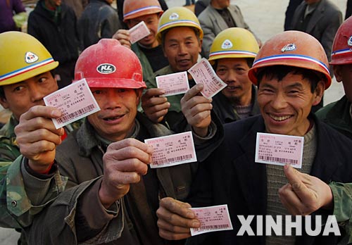 2007年1月30日,幾位來自四川樂山的農民工展示剛買到的火車票。當日,合肥火車站派專人將火車票送到合肥至潛山高速公路岳西段工地,為長年在深山里務工的農民工回家過年提供便利。(新華社記者李健攝)