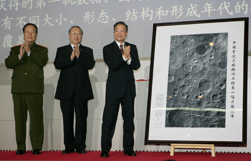 2007年11月26日,中國國家航天局正式公布嫦娥一號衛星傳回的第一幅月面圖像。中共中央政治局常委、國務院總理溫家寶來到北京飛控中心揭開圖像,并發表講話。 新華社記者黃敬文攝
