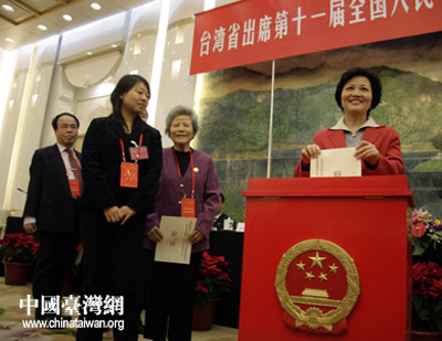 選舉結束后,全國人大常委會副委員長、秘書長盛華仁,中共中央統戰部部長杜青林等看望了當選代表。盛華仁代表全國人大常委會和吳邦國委員長,向當選代表表示熱烈祝賀。他說,全國人大代表既享有很高的榮譽,也肩負著重大的責任。各位當選代表,即將成為最高國家權力機關的組成人員,參與行使最高國家權力。歷屆臺灣省全國人大代表都為發展兩岸關系,促進祖國和平統一大業做出了積極貢獻。臺灣省第十一屆全國人大代表要充分發揮自己的優勢和影響,為促進兩岸關系的和平發展發揮更大的作用。