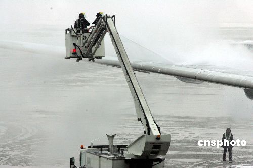 2月2日上午,2008年兩岸春節(jié)包機上海航點首個航班——東航MU五00七次航班,冒著數(shù)十年未遇的罕見風(fēng)雪在上海浦東機場起飛。圖為浦東機場為春節(jié)包機優(yōu)先提供特別的除冰服務(wù)。 中新社發(fā) 潘索菲 攝