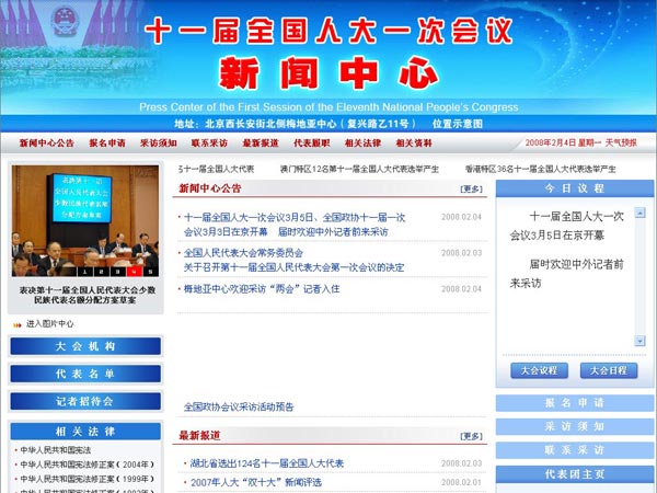 為方便記者采訪,兩個(gè)會(huì)議新聞中心分別開設(shè)網(wǎng)頁,及時(shí)通過互聯(lián)網(wǎng)發(fā)布采訪信息及與采訪相關(guān)的資訊。其中,十一屆全國人大一次會(huì)議新聞中心網(wǎng)頁地址為:www.npc.gov.cn,全國政協(xié)十一屆一次會(huì)議新聞中心網(wǎng)頁地址為:www.cppcc.gov.cn。兩個(gè)網(wǎng)頁已于4日同時(shí)開通。