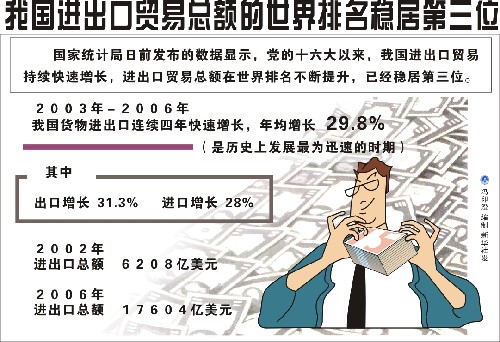 外貿是拉動經濟增長的重要發動機。5年來,中國進出口貿易總額快速增長,從2003年不足9000億美元,到2007年首次超過2萬億美元,在世界貿易大國排名穩居世界第三。