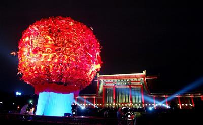 臺北市政府15日晚間舉行“囍迎曙光耀繁城”2008臺北燈節開幕典禮,主燈“金鼠娶親”以百只鼠子串聯成的繡球,與裝飾成紅瓦大厝的孫中山紀念館相互輝映。臺灣“中央社”記者孫仲達攝