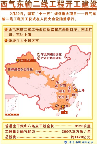 新華社北京2月27日電(記者劉錚、周英峰)2月22日,西氣東輸二線工程開工。這條9102公里的“長龍”建成后,對于優化我國能源結構,促進我國經濟社會發展,造福廣大人民群眾,具有重大意義。