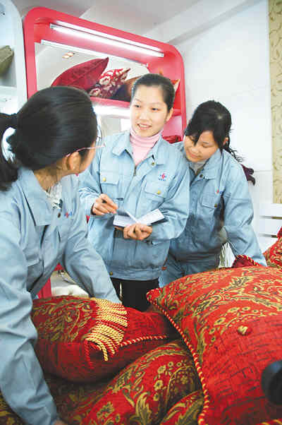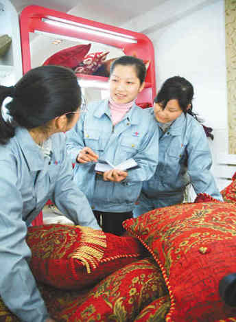 浙江代表團的楊曉霞代表是寧波市外來務工明星之一。圖為進京前,楊曉霞代表(中)來到姐妹們中間,傾聽大家的心聲。孫曉青 丁繼敏攝影報道