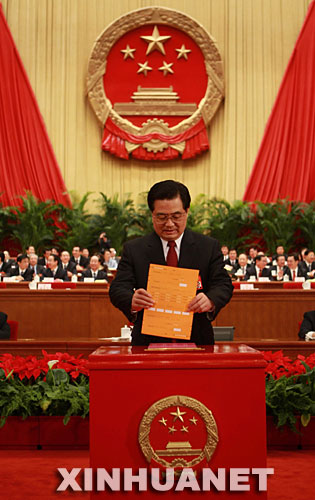 3月15日,十一屆全國(guó)人大一次會(huì)議在北京人民大會(huì)堂舉行第五次全體會(huì)議,選舉第十一屆全國(guó)人民代表大會(huì)常務(wù)委員會(huì)委員長(zhǎng)、副委員長(zhǎng)、秘書長(zhǎng);選舉第十一屆全國(guó)人民代表大會(huì)常務(wù)委員會(huì)委員;選舉中華人民共和國(guó)主席、副主席;選舉中華人民共和國(guó)中央軍事委員會(huì)主席。這是胡錦濤在投票。 新華社記者鞠鵬攝