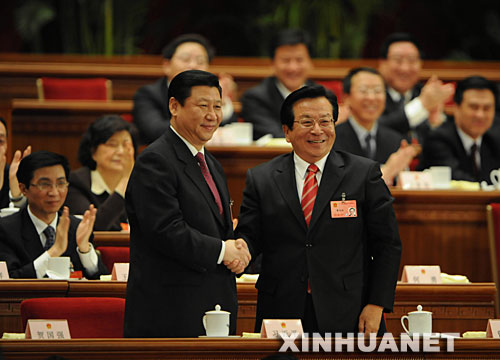 新華社北京3月15日電 第十一屆全國(guó)人民代表大會(huì)第一次會(huì)議15日上午以無(wú)記名投票方式,選舉胡錦濤為中華人民共和國(guó)主席、中華人民共和國(guó)中央軍事委員會(huì)主席,選舉吳邦國(guó)為第十一屆全國(guó)人民代表大會(huì)常務(wù)委員會(huì)委員長(zhǎng),選舉習(xí)近平為中華人民共和國(guó)副主席。