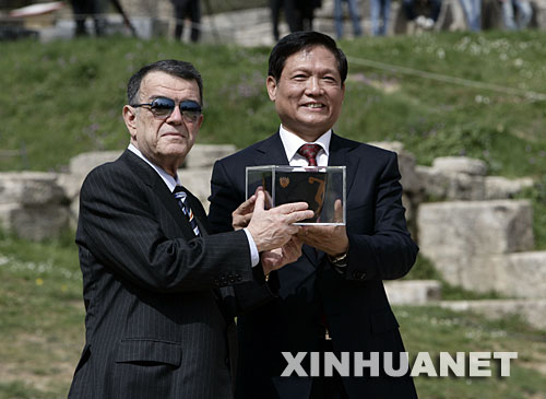 3月24日,希臘奧委會主席米諾斯·基里亞庫(左)在希臘古奧林匹亞遺址向中共中央政治局委員、中共北京市委書記、北京奧組委主席劉淇贈送紀念品。當日,北京奧運圣火取火儀式在希臘古奧林匹亞遺址舉行。 新華社記者李岳攝