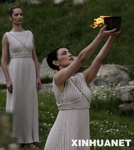 3月24日,北京奧運會圣火取火儀式在希臘奧林匹亞舉行。圖為最高女祭司舉起火種罐。 新華社記者李岳攝