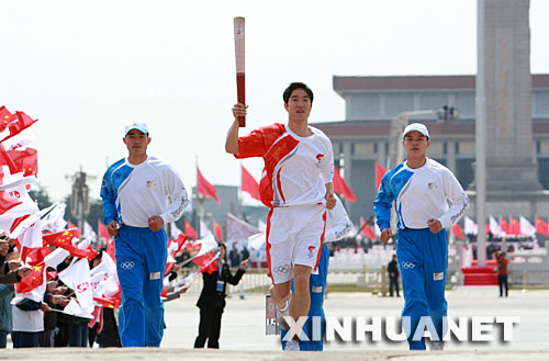 這是劉翔在儀式上手持火炬奔跑。(3月31日攝) 新華社記者鞠鵬攝