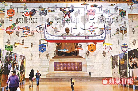 中國臺灣網4月2日消息 據臺灣媒體報道,昨天早上9時中正紀念堂(已更名為“臺灣民主紀念館”)的大門一開,被風箏、蘭嶼拼板舟“困”了三個月的蔣介石銅像終于“重見天日”,但兩旁的展板依然高掛。