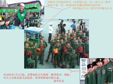 首先,圖中并不是中國的軍隊而是武警部隊;其次,根據新華社2004年的消息,2004從2005年1月1日起,武警部隊官兵將統一佩帶臂章、胸標,而照片中的武警戰士沒有佩戴臂章、胸標,說明這張照片至少拍攝于2005年之前;另一個事實是,根據西藏商報2004年10月的消息,從2004年10月13日起,拉薩市的人力三輪車將統一使用藍、紅、綠相間富有藏民族特色的簾布,而圖中的三輪車簾布的顏色使用的還是藍色簾布,說明這張照片拍攝的時間不可能拍攝于2004年11月之后。