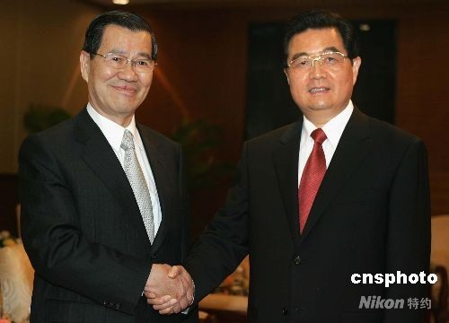 4月12日下午,國家主席胡錦濤在海南省博鰲會見出席博鰲亞洲論壇2008年會的兩岸共同市場基金會董事長蕭萬長。 中新社發 任晨鳴 攝