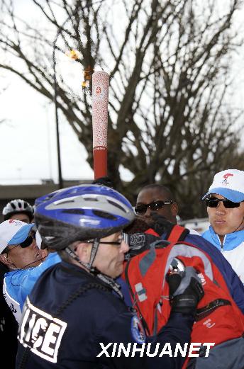4月7日,北京奧運圣火在巴黎傳遞時遭遇少數“藏獨”分子的干擾破壞。這是巴黎警察及時制止一名擾亂火炬傳遞者試圖從火炬手手中搶奪火炬。 新華社記者戚恒攝