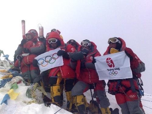 2008年5月8日,北京奧運圣火珠峰傳遞登山隊成功登頂珠峰。這是登山隊員在峰頂展示“祥云”火炬、火種燈、奧運五環(huán)旗和北京奧運會會徽旗。在這次報道中,中國移動公司在峰頂為新華社提供了良好的網絡信號,聯(lián)想公司為新華社提供了手持電腦,尼康公司專門為新華社改造了專業(yè)攝影器材,保證了新華社在世界最高峰首次實現現場圖片傳輸。新華社特約記者阿旺扎西攝