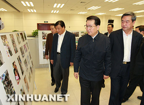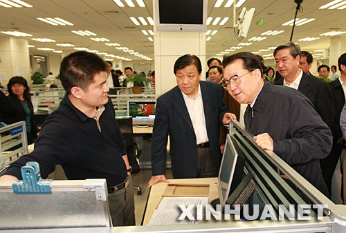 這是李長春在新華社新聞信息發稿中心觀看新華社播發的抗震救災新聞圖片。 新華社記者 龐興雷 攝
