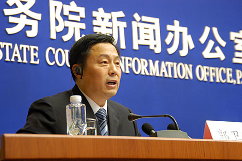 圖為國(guó)務(wù)院新聞辦新聞局局長(zhǎng)郭衛(wèi)民向大家發(fā)布5月17日四川汶川地震抗震救災(zāi)工作最新進(jìn)展情況。中國(guó)政府網(wǎng) 張泳攝