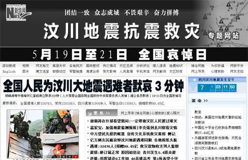 新華網“汶川地震抗震救災”專題網站(www.xhwenchuan.cn)整合文字、圖片、視頻、直播、訪談、論壇、博客、短信、手機報、flash等20多種網絡傳播形式,通過網上尋親、心理救助、愛心賑災、向遇難者志哀、為抗震救災支招等互動欄目,為廣大網民提供參與抗震救災、支援災后重建、奉獻智慧力量的渠道。人民網“抗震救災官網”(www.512gov.cn)包括新聞區、救助互動區、公益服務區、資料知識區四大板塊,開設實時報道、救援行動、抗災英雄譜、第一現場、網友寄語、網上求助、救援手冊、手機傳愛心等30多個子欄目。央視網“中國汶川抗震救災網”(wenchuan.cn)發揮視頻優勢,設立抗災紀實、災情匯總、自救攻略、防疫手冊、歷史借鑒、愛心捐助、我們在一起、我們感恩、短信推送、中國汶川抗震救災網上紀念館等20多個欄目。三個網站都設立中文版和英文版,并與手機新媒體互動,成為傳送黨和政府聲音、傳遞網民關切、服務災區生活、反映重建工作進展的網上平臺。