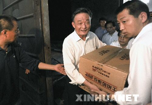 5月26日,中共中央政治局常委、全國人大常委會委員長吳邦國專程赴四川地震災區,慰問干部群眾,看望救援人員,指導抗震救災工作。這是吳邦國委員長在成都火車東站視察救災物資轉運情況,并搬起一箱食品。 新華社記者黃敬文攝