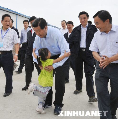 5月30日,中共中央政治局常委、全國政協主席賈慶林先后來到汶川特大地震震中區的映秀鎮和都江堰市等重災區,實地察看災情,慰問看望災區干部群眾和救援人員,指導抗震救災工作。這是賈慶林來到都江堰市幸福家園賑災居民安置點看望學生。帳篷幼兒園的孩子們高喊著“賈爺爺好賈爺爺好”跑過來,賈慶林親切地抱起一個撲進他懷中的孩子。 新華社記者 樊如鈞 攝