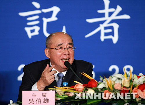 5月28日,中國國民黨主席吳伯雄回答記者提問。當(dāng)日,中國國民黨大陸訪問團(tuán)在北京舉行記者會(huì)。 新華社記者 龐興雷 攝