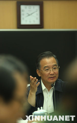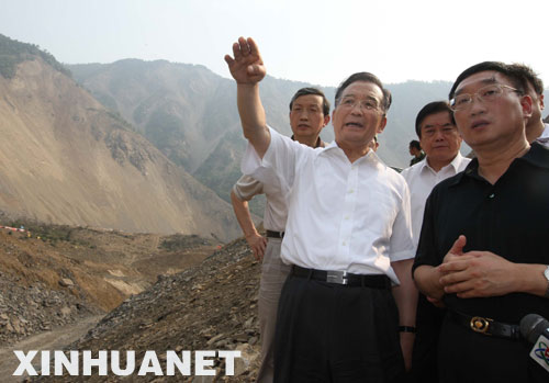 這是溫家寶在察看唐家山堰塞湖導(dǎo)流明渠,了解工程排險等相關(guān)情況。 新華社記者劉衛(wèi)兵攝