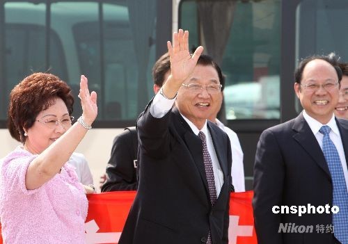 十一日下午三時十五分許,臺灣海峽交流基金會董事長江丙坤率海基會代表團抵達北京首都機場,向在場的中外媒體揮手致意。 中新社發(fā) 趙振清 攝