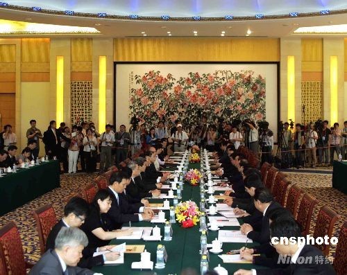 6月12日上午,海峽兩岸關系協會新任會長陳云林與臺灣海峽交流基金會董事長江丙坤在北京釣魚臺五號樓舉行會談。 中新社發 任晨鳴 攝