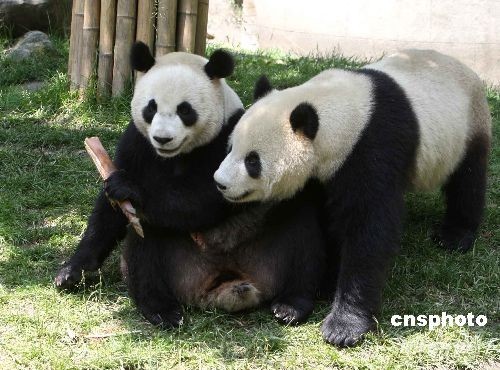 5月23日,準備贈送臺灣的大熊貓團團(右)和圓圓,在四川汶川大地震后的臥龍大熊貓保護區內無憂無慮地戲耍。 中新社發 任晨鳴 攝