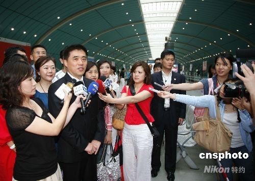 6月27日下午,臺北市長郝龍斌結束在上海的訪問,搭乘磁浮列車赴浦東國際機場返臺。郝龍斌向記者表示,此次上海之行很好,相信臺北與上海一定會雙贏。 中新社發 潘索菲 攝