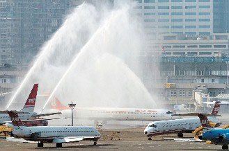 臺(tái)北松山機(jī)場立榮航空首班飛往上海包機(jī)上午8點(diǎn)7分出發(fā),臺(tái)北航站以水柱噴灑歡送。臺(tái)灣《聯(lián)合晚報(bào)》記者游順然攝