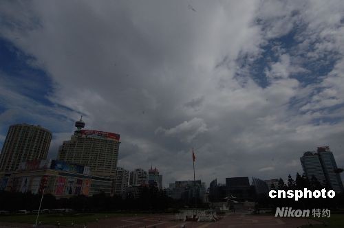 7月27日,福建省氣象臺發(fā)布臺風(fēng)黃色預(yù)警信號:福建省沿海臺風(fēng)警報。 臺風(fēng)"鳳凰"11時中心位于臺灣臺東縣偏東方約350公里洋面上,近中心最大風(fēng)力13級(風(fēng)速38米/秒)。未來繼續(xù)向偏西方向移動,將于28日早晨到中午在臺灣花蓮到臺東之間沿海登陸,然后向福建省中部沿海靠近。圖為當(dāng)日下午福州上空云層變化多端。 中新社發(fā) 劉可耕 攝