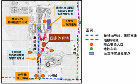 此外,觀眾也可以乘坐地鐵線抵達。一是乘坐地鐵10號線在北土城站出站,經安檢后換乘8號線(奧運支線),直達奧林匹克公園站;二是乘坐地鐵5號線至大屯路東站,換乘開幕式公交專線到達奧林匹克公園區東公交場站。