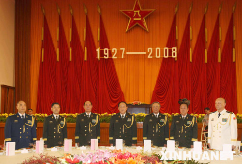 新華網(wǎng)北京7月31日電(記者曹智)中華人民共和國(guó)國(guó)防部7月31日下午在人民大會(huì)堂舉行盛大招待會(huì),熱烈慶祝中國(guó)人民解放軍建軍81周年。中央軍委委員、國(guó)務(wù)委員兼國(guó)防部長(zhǎng)梁光烈上將致祝酒辭。中央軍委委員、總參謀長(zhǎng)陳炳德上將,中央軍委委員、總政治部主任李繼耐上將,中央軍委委員、總后勤部部長(zhǎng)廖錫龍上將,中央軍委委員、第二炮兵司令員靖志遠(yuǎn)上將,中央軍委委員、海軍司令員吳勝利上將,中央軍委委員、空軍司令員許其亮上將出席招待會(huì)。