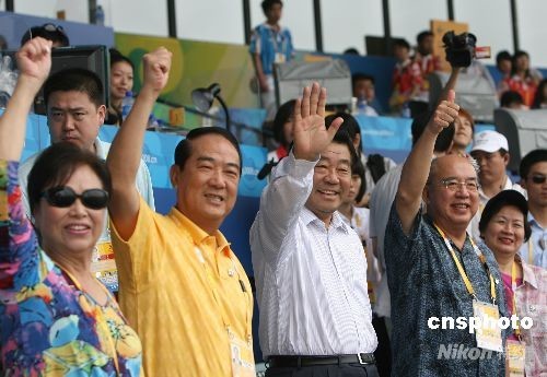 8月13日,北京奧運會棒球比賽揭幕戰在中華臺北隊和荷蘭隊之間舉行,中共中央政治局常委賈慶林與中國國民黨主席吳伯雄、親民黨主席宋楚瑜到現場觀戰,共同為中華臺北棒球隊加油。 中新社發 武仲林 攝