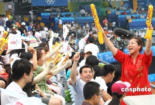 8月13日,2008北京奧運棒球賽在五棵松體育中心舉行,北京球迷拿著加油棒大聲喊“中華臺北加油”。 中新社發 CNAsports 攝