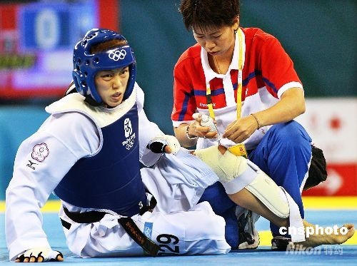 8月21日,在北京奧運跆拳道女子57公斤級預賽中,中華臺北選手蘇麗文(左)對陣韓國林秀貞,蘇麗文在比賽中膝蓋受傷數次跌倒,防護員上場防護時,蘇麗文神情相當痛苦,但仍撐到比賽結束。 中新社發 chinatimes 攝