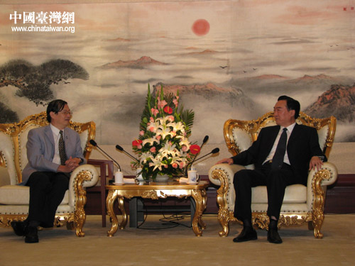 中共河南省委副書記陳全國(guó)(右)會(huì)見臺(tái)灣經(jīng)貿(mào)交流訪豫團(tuán)團(tuán)長(zhǎng)徐新生 (來源:河南省臺(tái)辦)