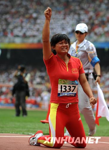 9月8日,中國選手姚娟在女子標槍F42-46級決賽中跪地慶祝。當日,北京2008年殘奧會田徑比賽在國家體育場“鳥巢”開賽,中國選手姚娟以40米51的成績打破女子標槍F42-46級世界紀錄,并獲得冠軍。新華社記者李尕攝