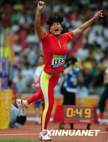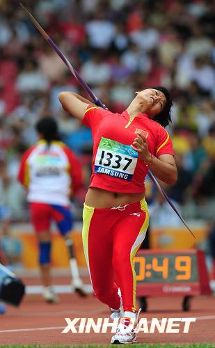 9月8日,中國選手姚娟在女子標槍F42-46級決賽中。當日,北京2008年殘奧會田徑比賽在國家體育場“鳥巢”開賽,中國選手姚娟以40米51的成績打破女子標槍F42-46級世界紀錄。新華社記者李尕攝