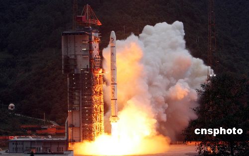 北京時間去年十月二十四日十八時零五分,中國在西昌衛星發射中心用“長征三號甲”運載火箭將“嫦娥一號”衛星成功送入太空。“嫦娥一號”是中國自主研制的第一顆月球探測衛星,它的發射成功,標志著中國實施繞月探測工程邁出重要一步。火箭點火升空24分鐘后,北京航天飛行控制中心傳來的數據表明,星箭成功分離,“嫦娥一號”衛星進入近地點205公里,遠地點50930公里的地球同步轉移軌道。 中新社發 孫自法 攝