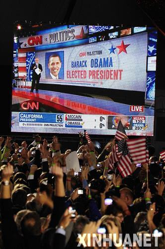 新華網華盛頓11月4日電(記者楊晴川 嚴峰)美國各大電視網公布的初步統計結果顯示,美國民主黨總統候選人貝拉克·奧巴馬在4日舉行的總統選舉中擊敗共和黨對手約翰·麥凱恩,當選第56屆美國總統。他將成為美國歷史上首位非洲裔總統。