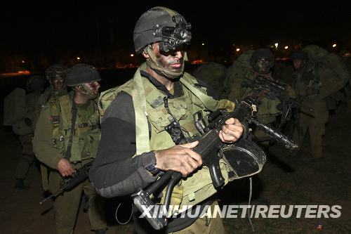1月3日晚,以色列軍人向加沙地帶前進(jìn)。來自以色列和巴勒斯坦方面的消息證實(shí),以軍當(dāng)?shù)貢r(shí)間1月3日晚間8時(shí)30分左右展開了對(duì)加沙地帶的地面攻勢(shì)。 新華社/路透