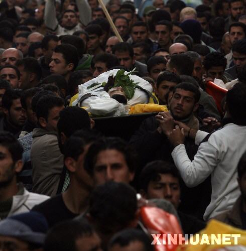 1月17日,在加沙地帶北部,巴勒斯坦人為以色列空襲中的遇難者舉行葬禮。以色列安全內(nèi)閣當(dāng)晚投票決定,在加沙地帶實(shí)行單方面停火。以色列自去年12月27日向加沙地帶發(fā)動(dòng)大規(guī)模軍事打擊,至今已造成超過1200名巴勒斯坦人死亡,超過5300人受傷。 新華社記者納賽爾攝