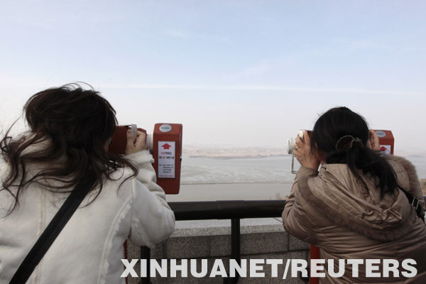 1月30日,在靠近韓朝邊界韓國北部京畿道坡州市,兩名游客用望遠鏡向朝鮮方向觀望。新華社/路透